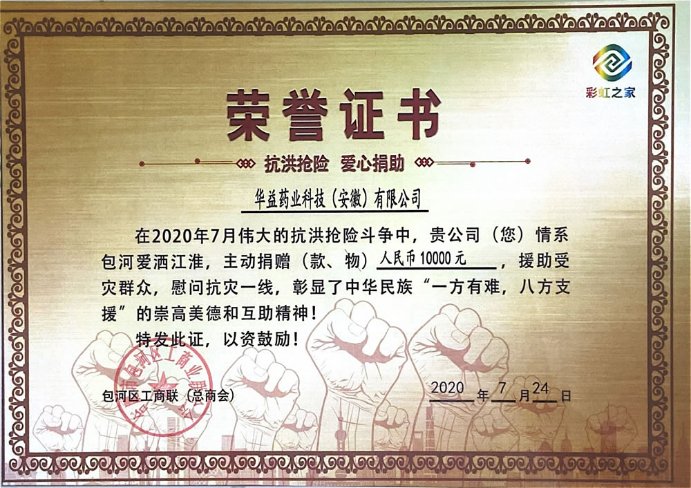 在2020年7月,江淮大地抗洪搶險斗爭中,華益藥業(yè)不忘初心,積極投身抗洪一線,關(guān)愛受災(zāi)群眾,情系江淮,愛灑包河,捐贈人民幣壹萬元整,為災(zāi)區(qū)重建盡綿薄之力。